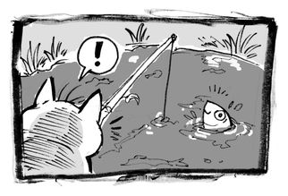 Storyboard: Cat went fishing and he was usually very good at catching fish until one fateful day, a fish got smarter and decided to trick him and bit off the bait on the fishing hook without getting hooked itself. Thus, the cat got angry and sought revenge by building himself a suit to go underwater and tries to annihilate the bad fish in the sea and thus Aquacat was born!